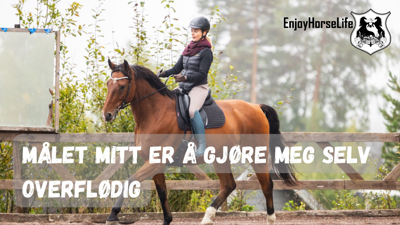 Jeg ønsker og jobber for at du skal bli så sikker at du ikke trenger meg lenger. At du skal forstå hesten din så godt at du vet hva som fungerer. At du skal kjenne deg selv så godt at du tar kloke valg. At du har verktøyene, kunnskapen og selvtilliten til å løse opp i det som måtte komme som hindringer din vei.